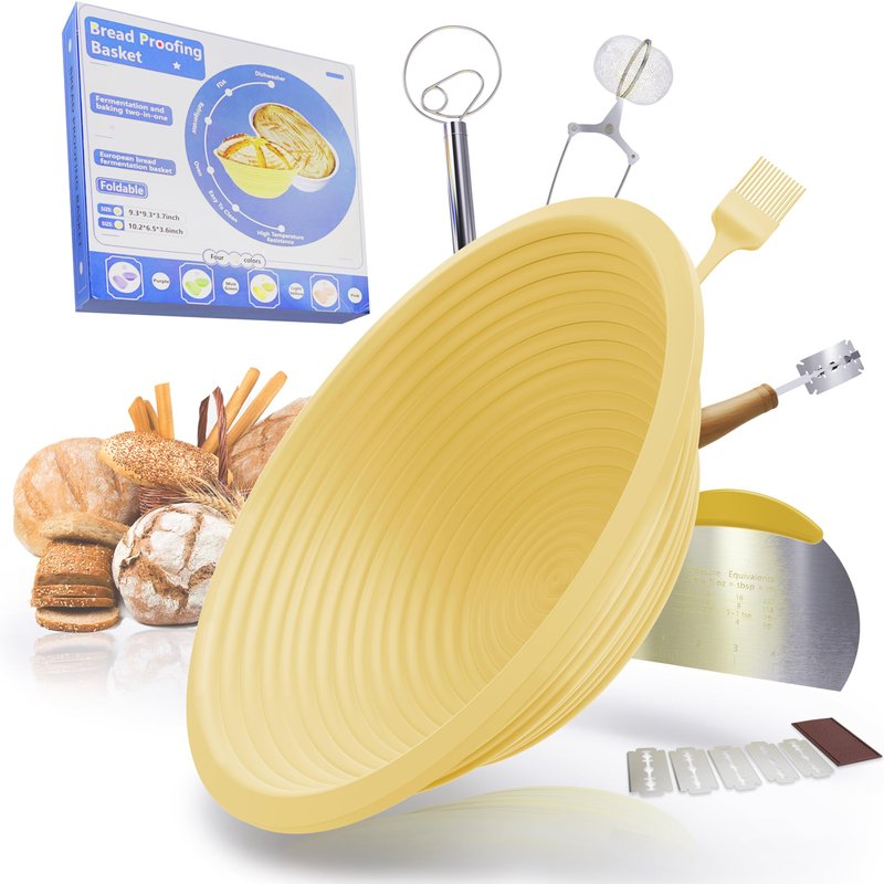 Our multifunctional silicone bread proofing basket and professional tool set, designed for baking enthusiasts and home bakers, make the process of creating delicious, healthy homemade bread simple and enjoyable. This durable, easy-to-clean sourdough proofing basket, made from food-grade silicone, features a natural non-stick quality and an elegant round design that allows your dough to expand evenly, shaping various styles of bread with ease. Accompanied by a sharp Lame, efficient Whisk, a delicate flour duster, a silicone flour brush, and a stainless-steel dough scraper, our sourdough starter kit brings professionalism and precision to your bread-making endeavors. The product's user-friendly design includes easy cleaning, compact storage, and high temperature resistance, making it suitable for everyday family use, professional-level baking attempts, healthy living, and parent-child interactive activities. As people increasingly value the quality and origins of their food, this proofing bowls for sourdough bread serves not only as a practical tool for achieving high-quality bread but also as a medium for sharing warmth and joy within families. Whether it's used to enhance personal baking skills or given as a gift to friends and loved ones, our silicone bread proofing basket is an indispensable partner in your kitchen, supporting you on your longer baking journey.