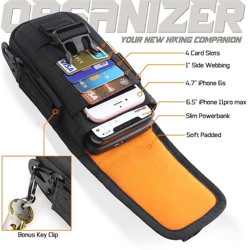 - RUGGED NYLON MATERIAL WITH SOFT INNER INTERIOR: Molle phone pouch constructed by durable premium 1000D nylon fabric. Shockproof soft velvet padded interior lining protects your smartphone and cards in any outdoor condition.
