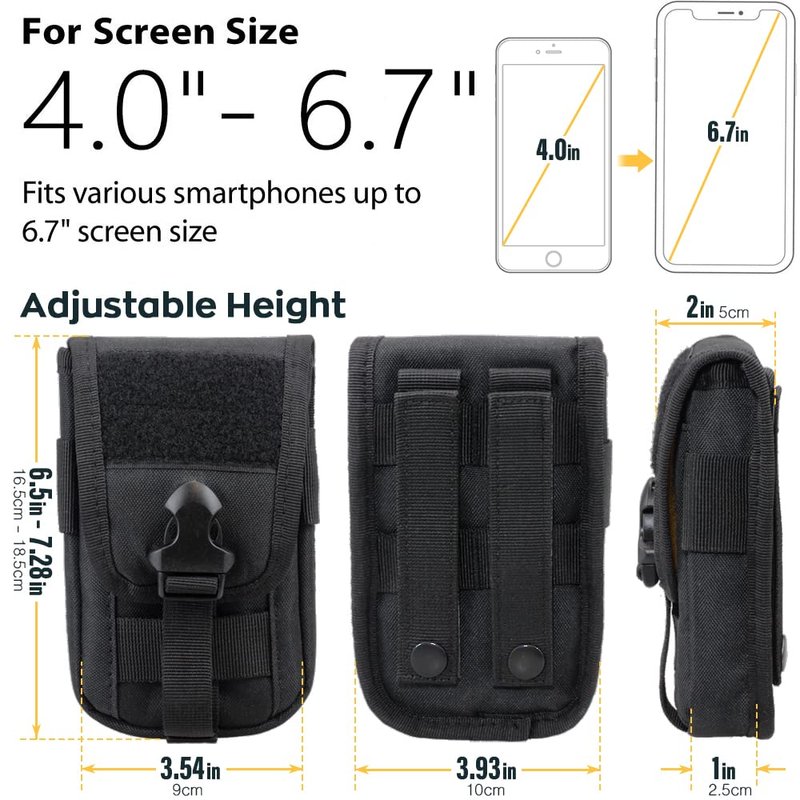 - LARGE DOUBLE CAPACITY: Molle phone holder features two compartments, available to hold two cell phones or cash. 4 card slots allow you storage small tools ID card and credit card, receipts, or some cash while on the go. Dimensions: 18cm(H)*10.4cm(W)*6cm(T)/6.5"(H)*4.1"(W)*1.5"(T).