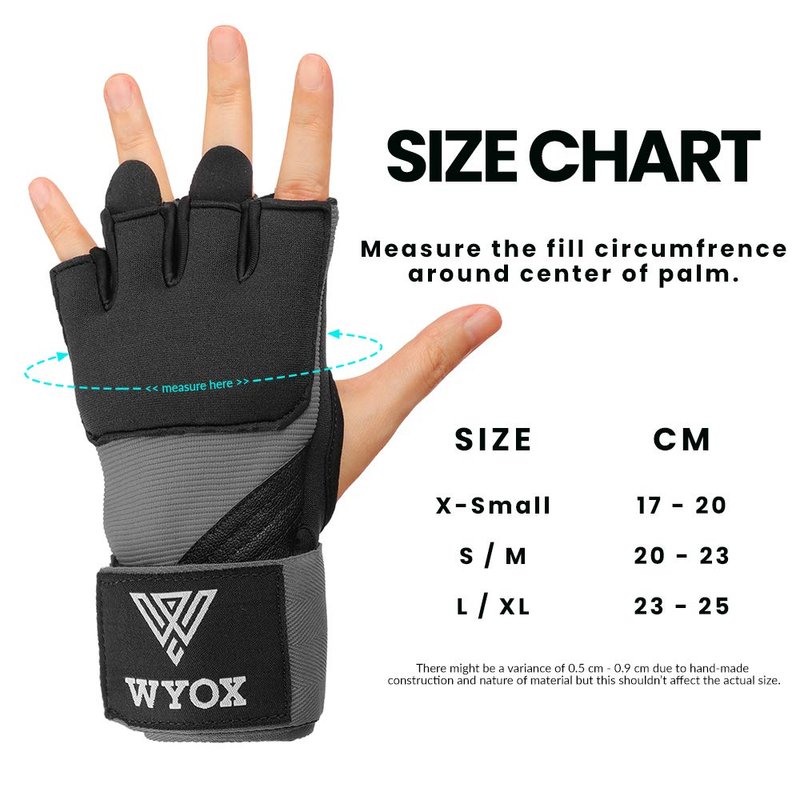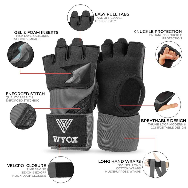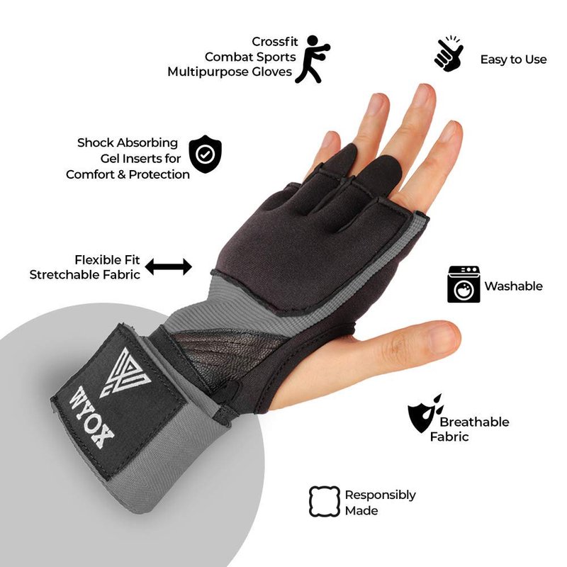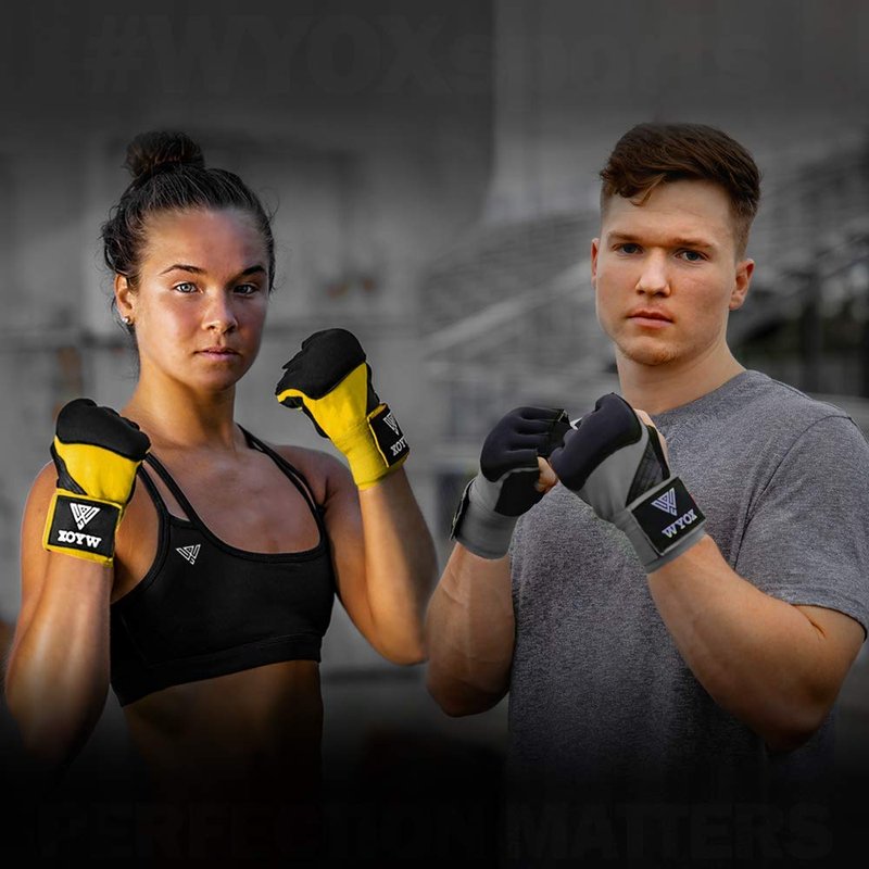 WYOX Quick-Wrap kickboxing gloves for women & Men Features: Super Thick (8mm) Neoprene Gel knuckle Shield to Ensure Maximum Protection & Comfort. Maximum Impact Area Coverage Cushion (Stitched for Durability) Lightweight Breathable Mesh offers Palm breath-ability, Comfort & serves as boxing gloves deodorizer. Amara Infused Lightweight Mesh Offers Enhanced Durability. Elasticized wrap material on the weighted gloves offers maximum comfort during strenuous training. Expect durability and air permeability through the Japanese Amara Palm that is fitted on the boxing hand wraps. The training gloves have a neoprene wrist enclosure that has hook and loop to ensure that the glove is tightly fastened around your wrist. Ideal boxing tape for hands, wrist wraps boxing mma gloves, Men Womens boxing gloves, boxing wraps women, wrist wraps boxing, men fighting gloves, mma sparring gloves, mma gloves women boxing gloves boxing wrist wraps boxing gear wrap, kids boxing wraps, heavy bag gloves women, ufc gloves men, kids muay thai gloves, heavy bag gloves, kick boxing equipment. Advance Protection || Super Shock-absorbing Neo Gel Padded Knuckle Shield Maximum Comfort || Easy-on Hand wraps / Easy-off loop / Velcro Closure Wrist wrap Enhanced Durability || Japanese Amara Infused Breathable Mesh Allows Air Permeability Improved Design || Max Impact Coverage, Stitched Contoured Gel Neoprene WYOX sports || 100% Customer Satisfaction / Dedicated Customer Service rival sparring gloves
