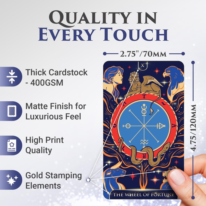 - Enhanced Durability: Our beautiful tarot deck crafted with high-quality materials, including thick 400 gsm cardstock, a matte finish, and a durable, compact carrying box that prevents bending and sticking of tarot deck cards