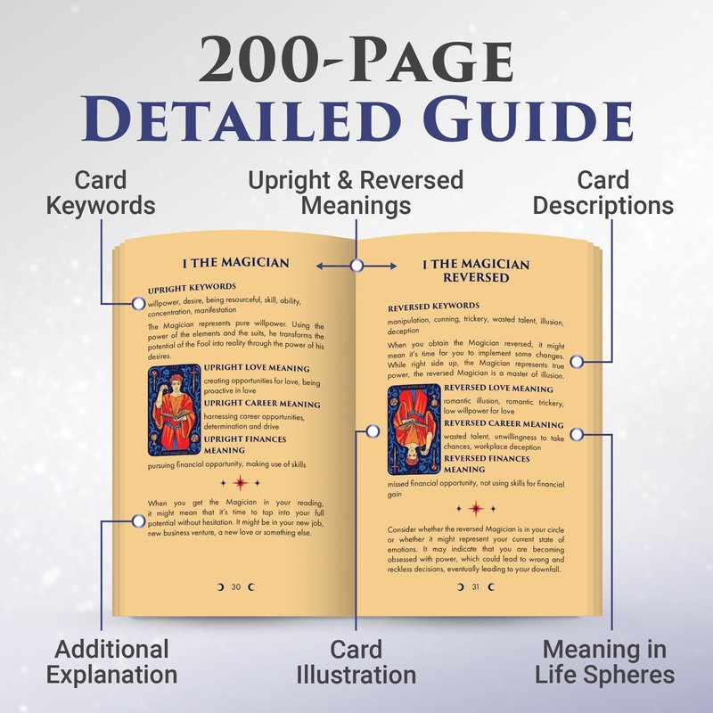 - Beginner Tarot Cards: Clear symbolism, traditional tarot deck structure, and an easy-to-follow, 200-page detailed tarot guide book make the Starlight Tarot accessible as a beginner tarot deck