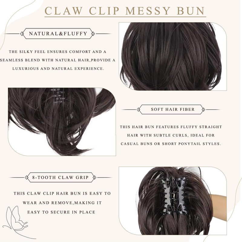 - 【Natural and Fluffy】This hair bun, featuring fluffy straight hair and subtle curls, seamlessly blends with your hair's texture for casual, refreshing styles. The 8-tooth claw clip ensures secure placement, making it perfect for creating natural-looking buns or short ponytails that stay in place all day.