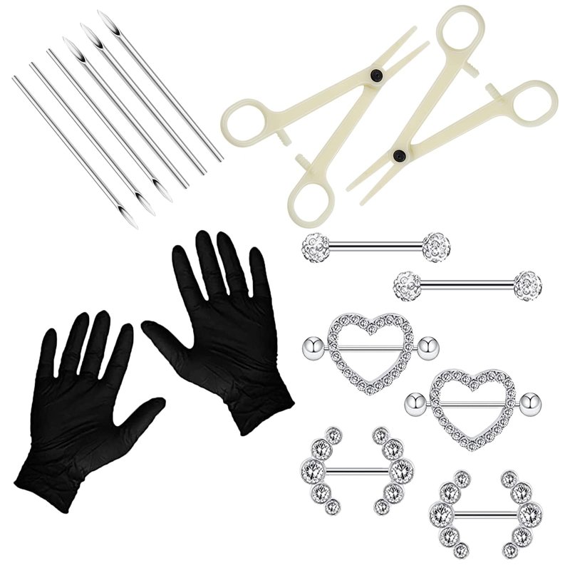 - What Can You Get - The nipple piercing kit includes 6pcs nipple rings, 3pcs 14G piercing needles, 3pcs 13G piercing needles, 2pcs disposable piercing clamps, 2pcs black latex gloves and 6pcs cotton pads.