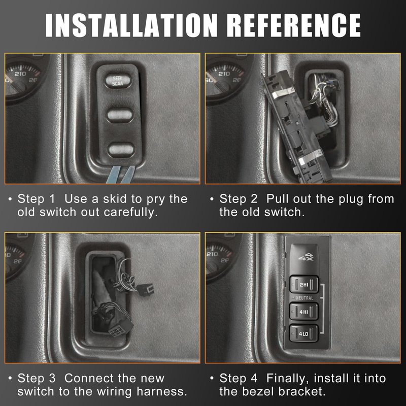 - Without Auto:This four-wheel drive selector switch is also known as a transfer box switch, all-wheel drive switch, four-wheel drive, or 4x4 switch. There is a 4x4 button instead of an AUTO 4W button. Before purchase, check the appearance of the original switch to ensure that they are consistent with the pictures listed.
