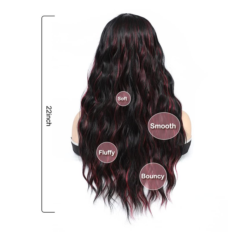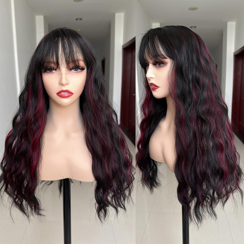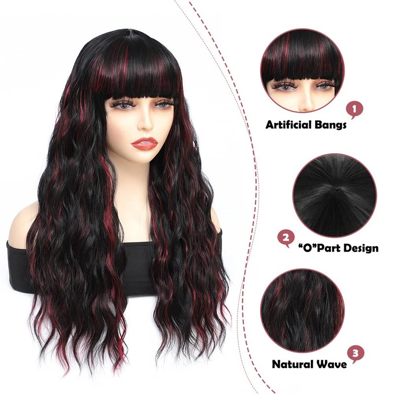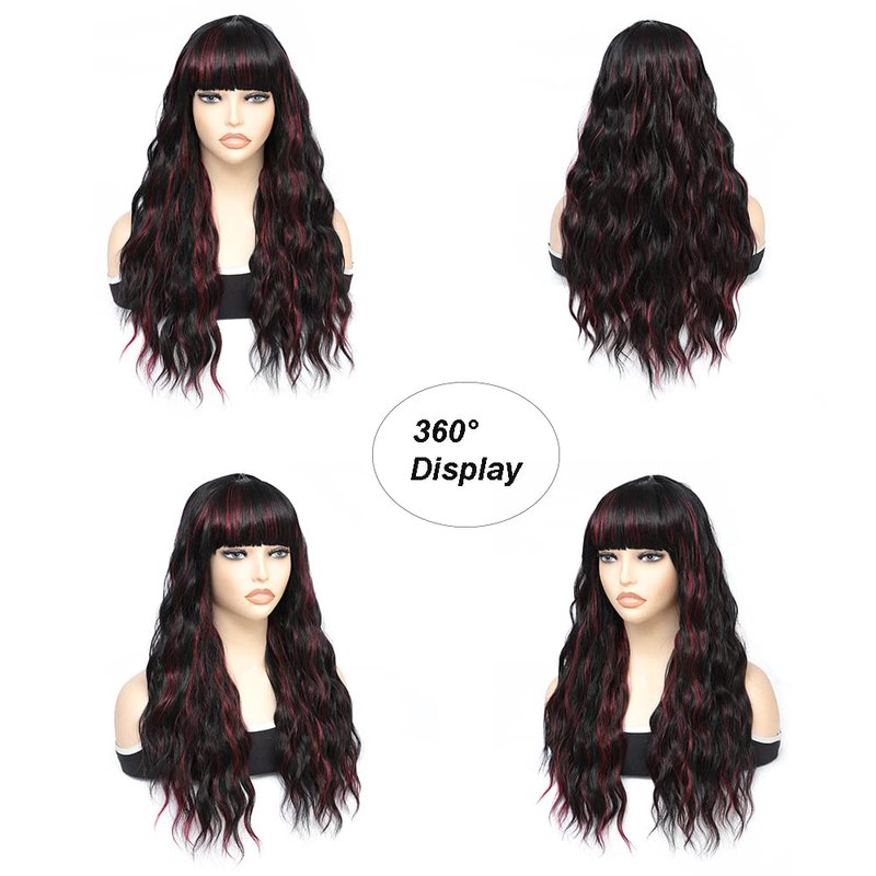 - Premium Material:Black and red piano color Wavy Wigs with Bangs made of high quality heat resistant synthetic fibers, smooth, bouncy without fake shine, you can trim, wash,Can be Straight & Curled (under 185 ℃).Packaging in a box keeps this bangs wig in its original shape.What you get is what you see.