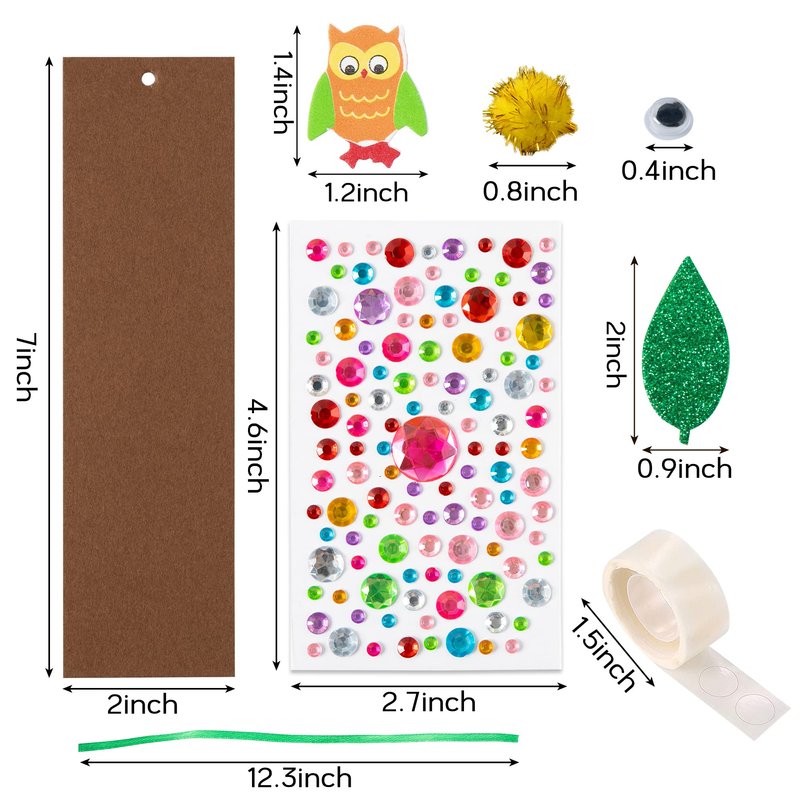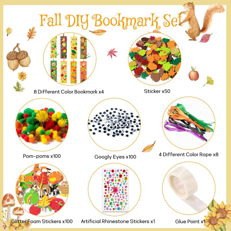 - WHAT YOU GET--Come with 32 pcs blank bookmarks in 8 different colors, 100 pcs glitter foam stickers of fall designs, 100 pcs pom-poms(with plain and glitter 2styles), 100 pcs googly eyes, 19pcs fall pattern foam stickers, 32 pcs satin cords in 4 colors, 1 sheet artificial rhinestone stickers, 1 roll of adhesive dots.
