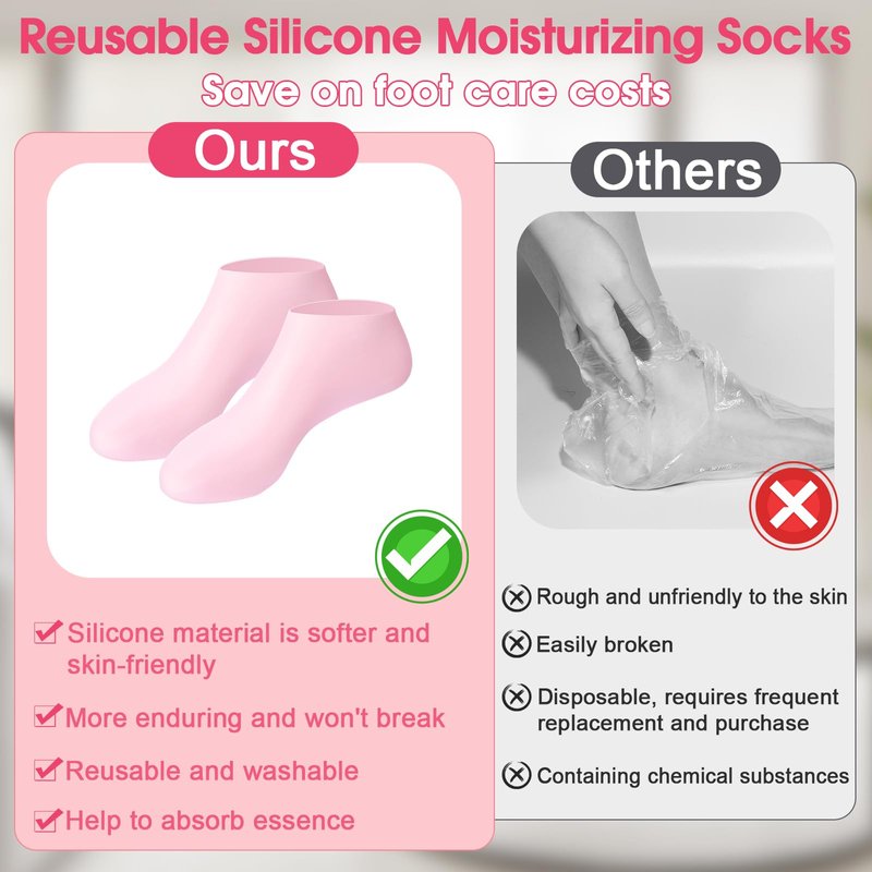 - Easy to Use:Simply apply lotion or moisturizer to your feet and put on the silicone socks. Wear them for at least 20-30 minutes at a time and use them 3-4 times a week to prolong and enhance the effect. This will easily relieve dry, cracked and rough skin and make your feet softer, more beautiful and healthier with added elasticity. After use, simply rinse the silicone socks with water to easily remove any remaining lotion or moisturizer. Note: Silicone socks contain anti-stick powder, not dust.