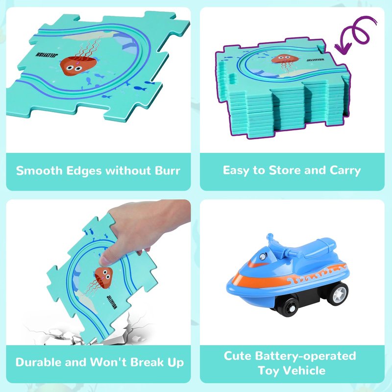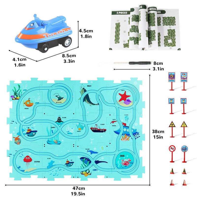 - Children's Educational Puzzle Track Car Play Set: This kids toys set includes 12 puzzles pieces, 12 road signs, 1 instruction manual, 1 water scooter shaped vehicle(1 AAA battery required, not included)