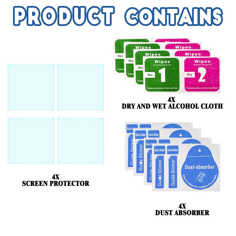 - Product includes: 4 x Screen Protector; 4 x Alcohol Prep Pad; 4 x Dust Absorber.