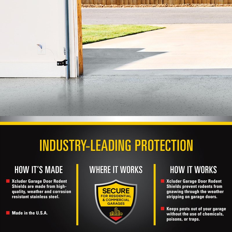 - HIGH QUALITY & WEATHER RESISTANT: Xcluder Garage Door Rodent Shields are made from high-quality, weather and corrosion resistant stainless steel. Apply to the base of the rubber weather strip on the garage door jamb to create an impenetrable barrier.