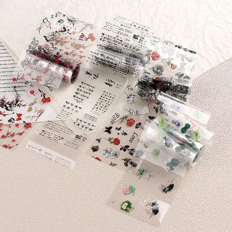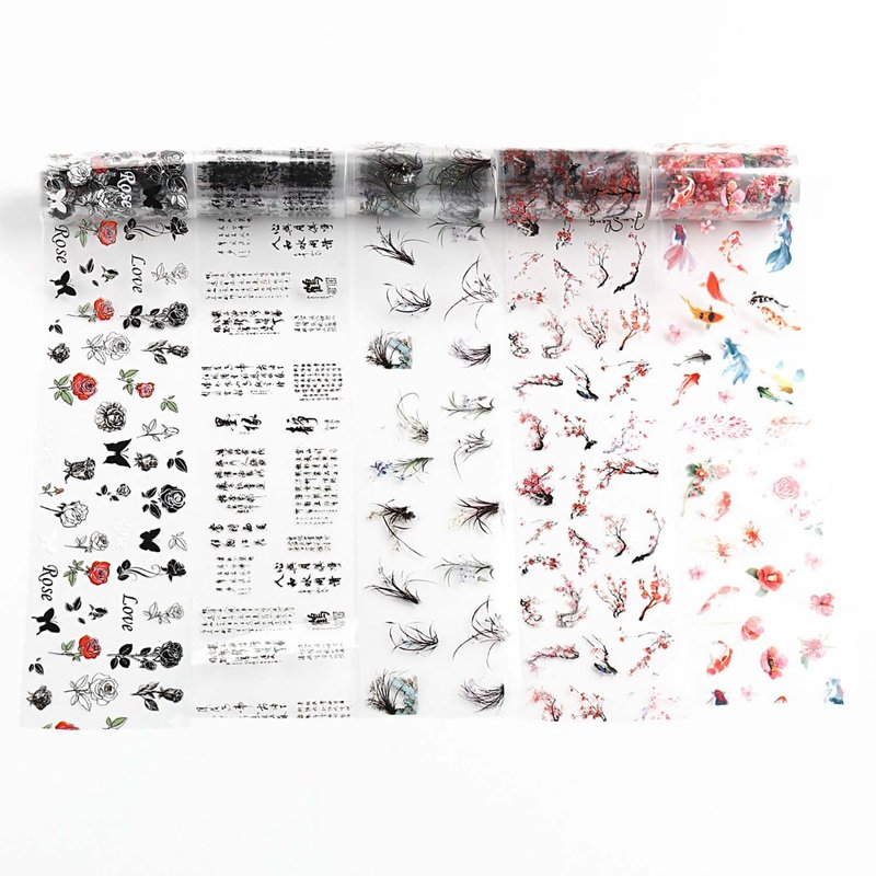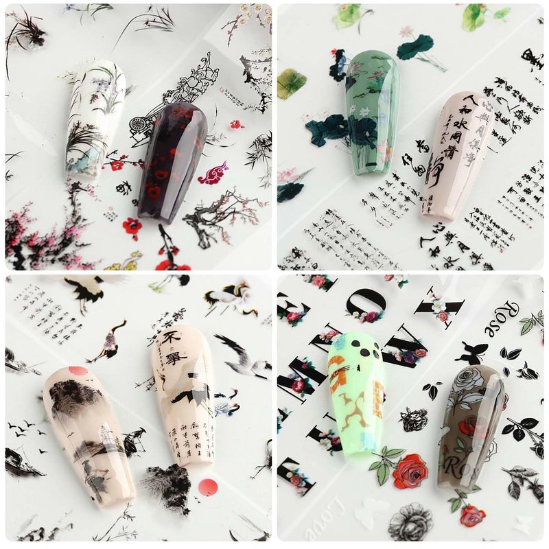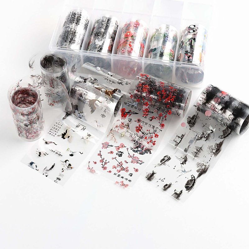 - 🌺【Package Contents】: 10 rolls chinese characters ink painting nail art transfer foil stickers set with a storage box. 1.57inchs*39.4inchs (4*100cm). Bigger size and more attractive design.