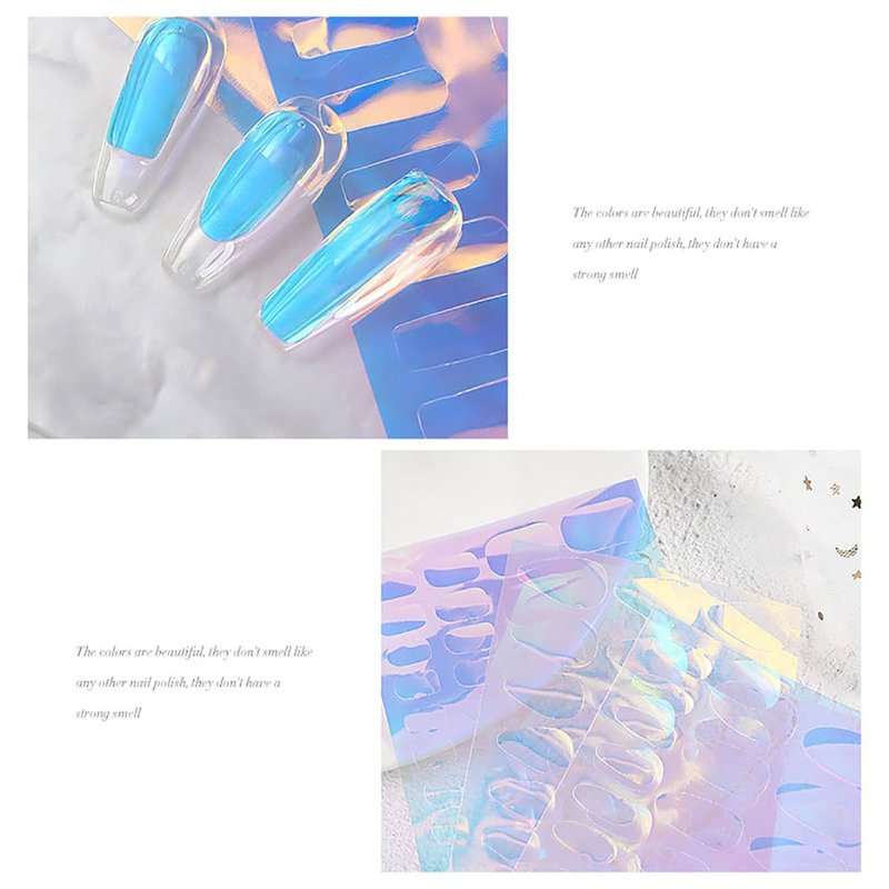 - Aurora Cellophane Nail Stickers - These transparent aurora cellophane nail stickers can show different colors at different angles, decorate your nails and make your nails look more beautiful, simple and elegant, beautiful and fashionable. So many colors and designs, enough to mix and match and do a different set every single day if you wanted!