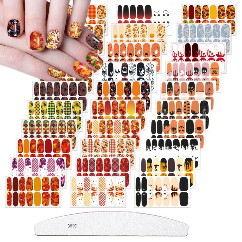 - PACKAGE CONTENTS - comes with 30 sheets Halloween full nail stickers in different patterns and sizes, each sheet contains 14 pieces, totally 420 pieces, sufficient to meet your DIY nail art decoration needs, comes with 1 piece moon shape nail file, can bring much convenience to the DIY process.