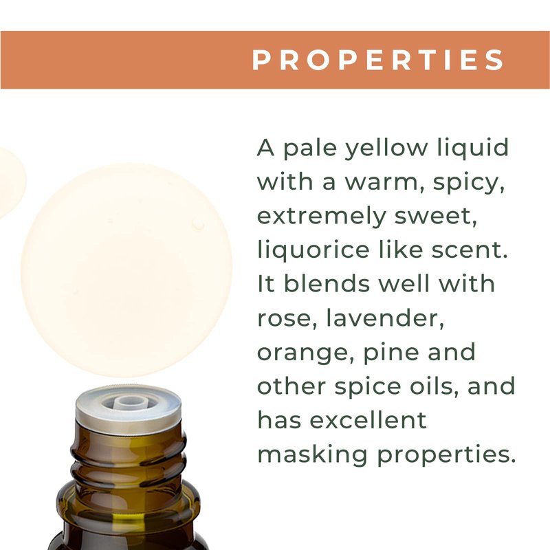 - PHYSICAL PROPERTIES: Physical properties of this oil include its pale yellow liquid with a warm, spicy, extremely sweet, liquorice like scent. It blends well with rose, lavender, orange, pine and other spice oils, and has excellent masking properties, giving off an almost warm and inviting aroma. Its oil consistency should make it quite easy to apply and dilute in carrier oil for skin use.