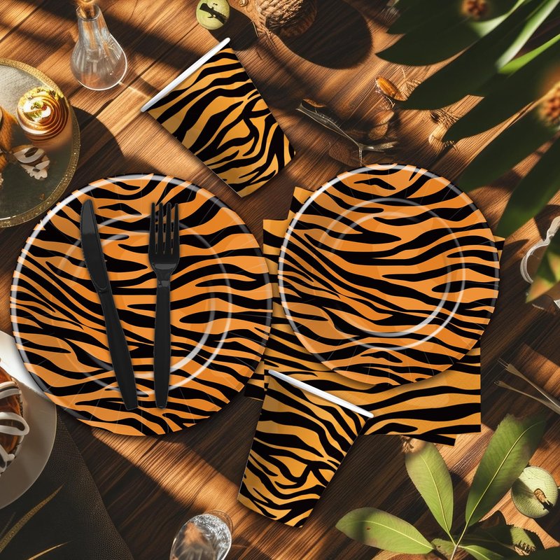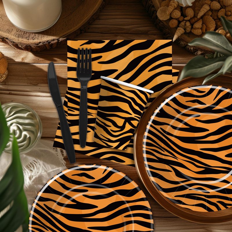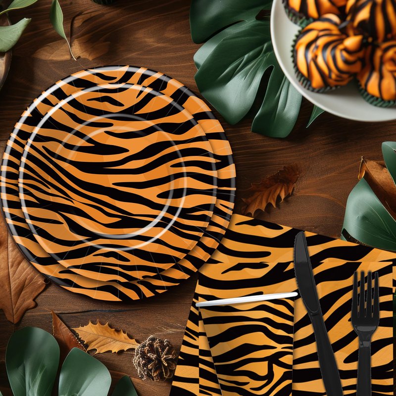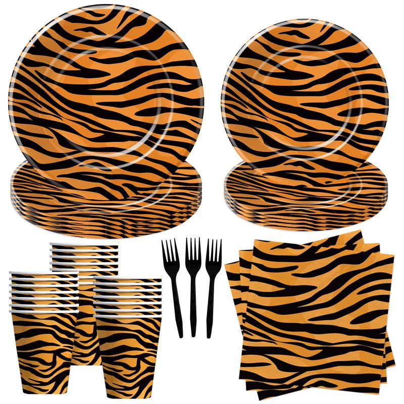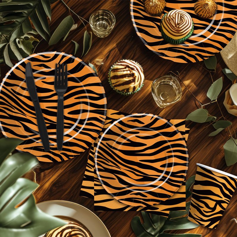 - 【Serve 24 Guests】This jungle tiger print birthday decorations tableware set can accommodate up to 24 guests and includes everything you need: 24pcs 9'' Tiger Print dinner plates, 24pcs 7'' dessert plates, 24pcs napkins, 24pcs cups, 24 sets of disposable forks. Get these tiger theme party decorations to elevate your celebration