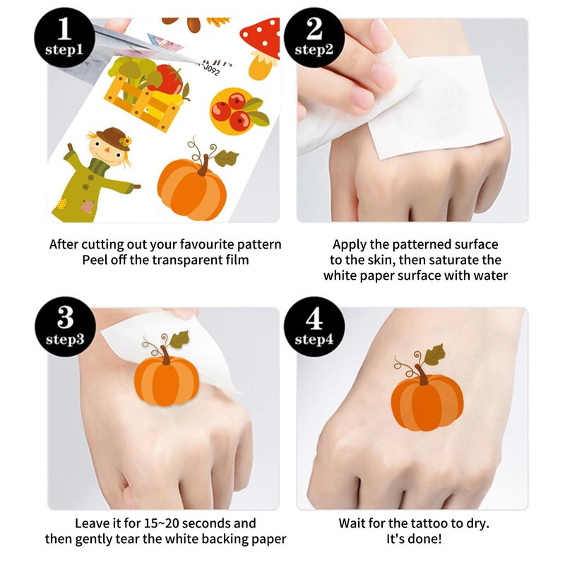 - Occasion: Autumn tattoo stickers are particularly suitable for use at various parties such as Thanksgiving, Christmas, Halloween, Harvest Festival, etc. They are perfect as decorations for autumn and can be worn on the body