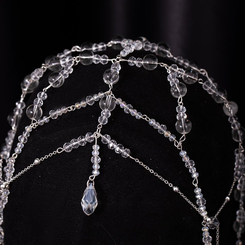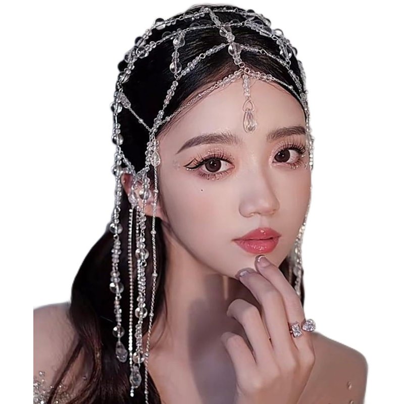 Xerling Transparent Crystal Beads Tassel Cap Headpiece 1920s Flapper Layered Head Chains Wedding Bridal Head Jewelry Cleopatra Hair Accessories for Women