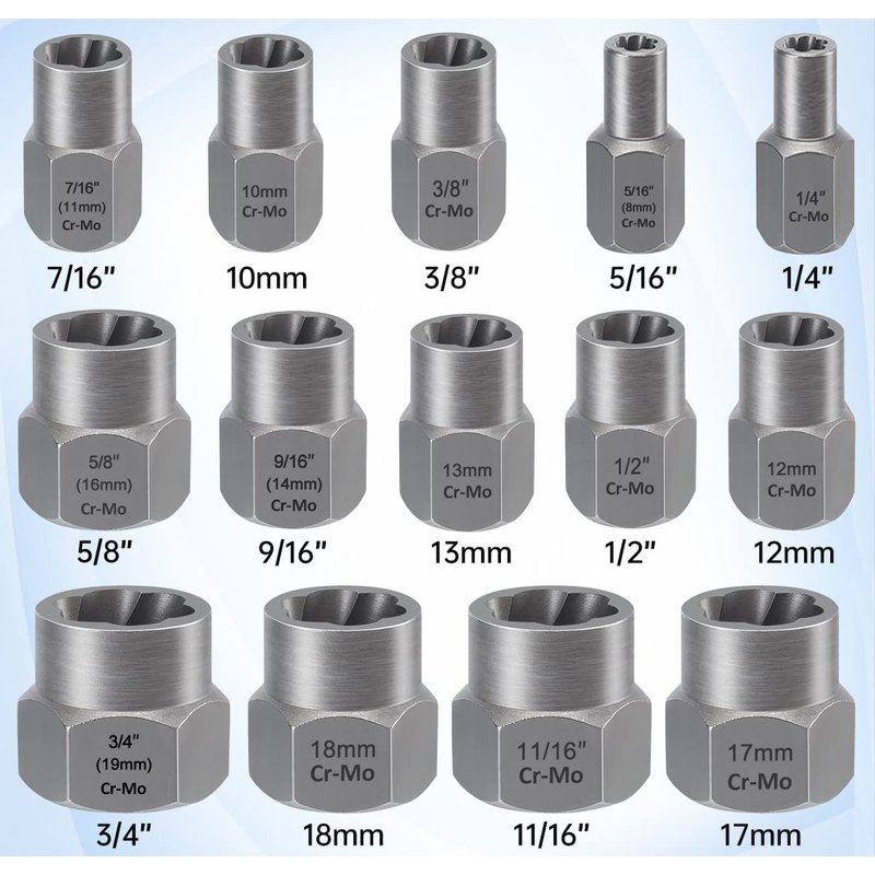 - 🔩14PCS 3/8 inch drive bolt remover set includes: 3/4''(19mm),(18mm),11/16'',17mm,5/8''(16mm),9/16''(14mm),13mm,1/2'',12mm,7/16''(11mm),(10mm) ,3/8'', 5/16''(8mm),1/4'', Heavy-duty blow-molded case lets all the extraction sockets stay organized and take your set on the go.