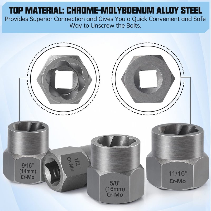 - 🔩Each bolt extractor is made of high hardness chrome-molybdenum steel for superior durability and longer life. It will easily extract damaged bolts, nuts, and screws even if they are stripped, rusted, or frozen.