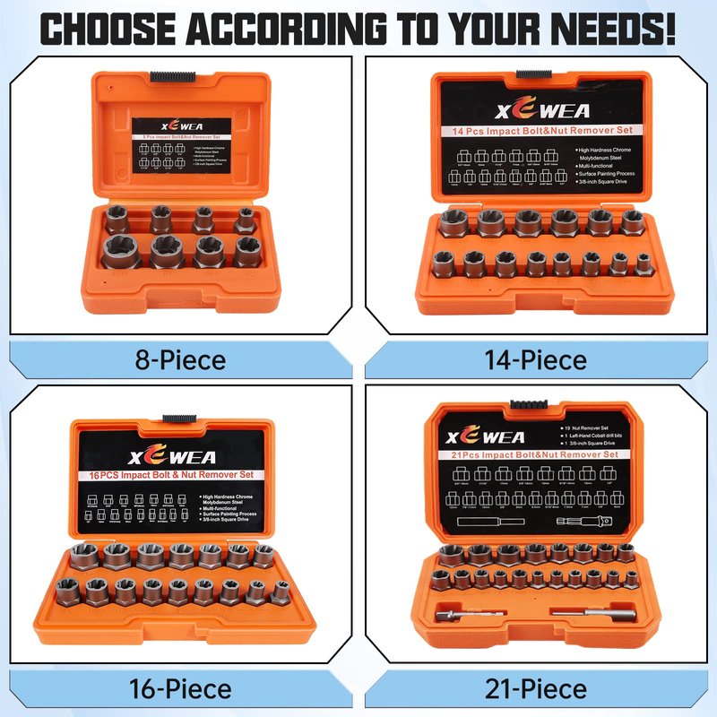 - 🔩Includes 14 pieces of the most used SAE and metric sizes impact bolt extractors, which can meet various needs that are usually required, whether it is car repair or home repair. XEWEA provide free warranty or return within one year!!!