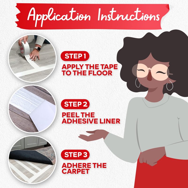 - Secure area rugs and carpets in place with our double sided carpet tape heavy duty. Our double sided tape for rugs to stay in place is great to keep rug in place on carpet, hardwood floors, and carpet-to-carpet applications.