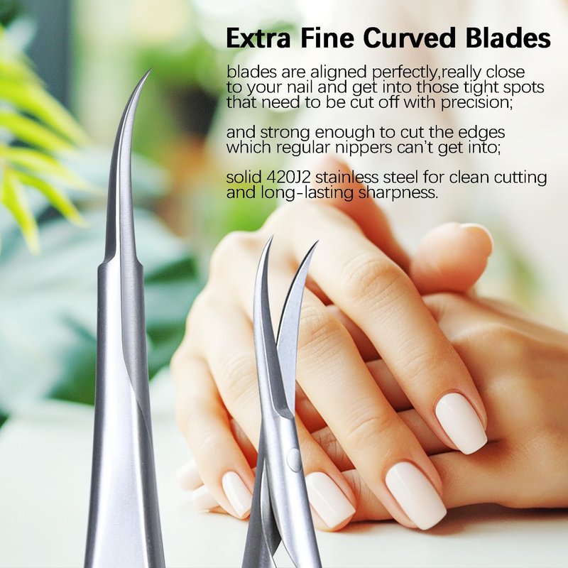- Cuticle Scissors Extra Fine Curved Blades - Curved micro skinny tip point can get in really close to your nail, blades are aligned perfectly, will really get into those tight spots that need to be cut off with precision; And the blade is also strong enough to cut the edges of fingernails and toenails which regular clippers/nippers can’t get into; suitable for most tasks of the everyday nail cutting or beauty grooming;