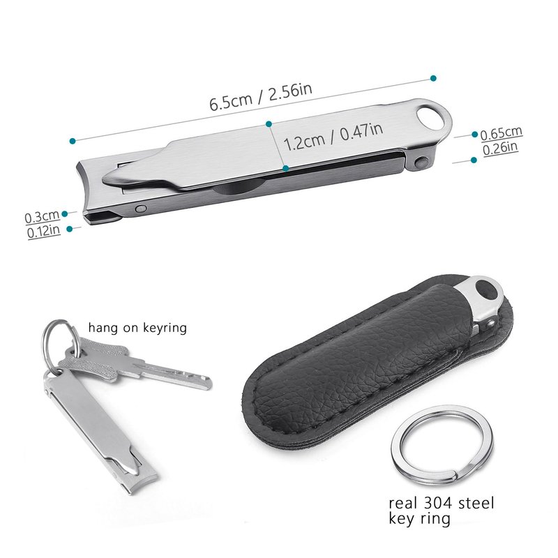 This nail clipper designed has a conveniently built-in nail file and folds flat,the thickness of the nail clipper is only 0.6cm/0.24in,length is only 6.4cm/2.52in,easy carried in wallet or bag;and comes with a keyring,can also be carried with your keys;