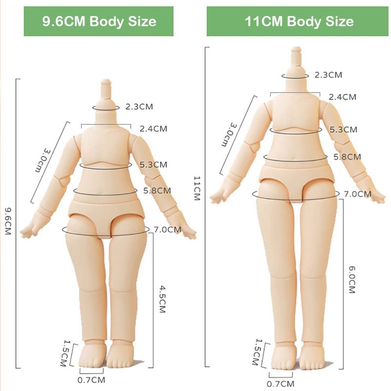 1:About size: two sizes. The standard version is about 9.6cm tall. The extended version is about 11cm tall. Please refer to the product picture for specific size information. Because the size is measured manually, there will be some errors. Please understand. This body is similar to OB11CM, and clothes and shoes accessories can basically be used universally.
