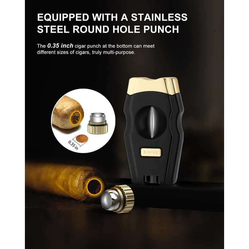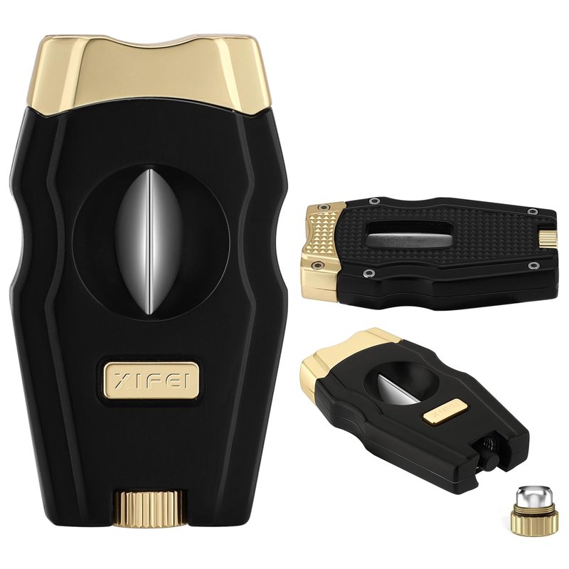 XIFEI Cigar Cutter, Stainless Steel V-Cut Cigar Cutter Built-in Cigar Puncher (Black Gold-1)