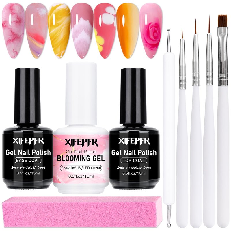 - Gorgeous Blooming Effect: XIFEPFR nail blooming gel Christmas gift kit contains clear blooming gel, top coat, base coat, dotting tool and 4pcs nail brushes to make a blooming gel effect for gel nail polishes of any colors. With this blooming gel kit, you can effortlessly create nail designs such as watercolor, natural stone, marble, stripe, floral print, tie dye, gradients and more.