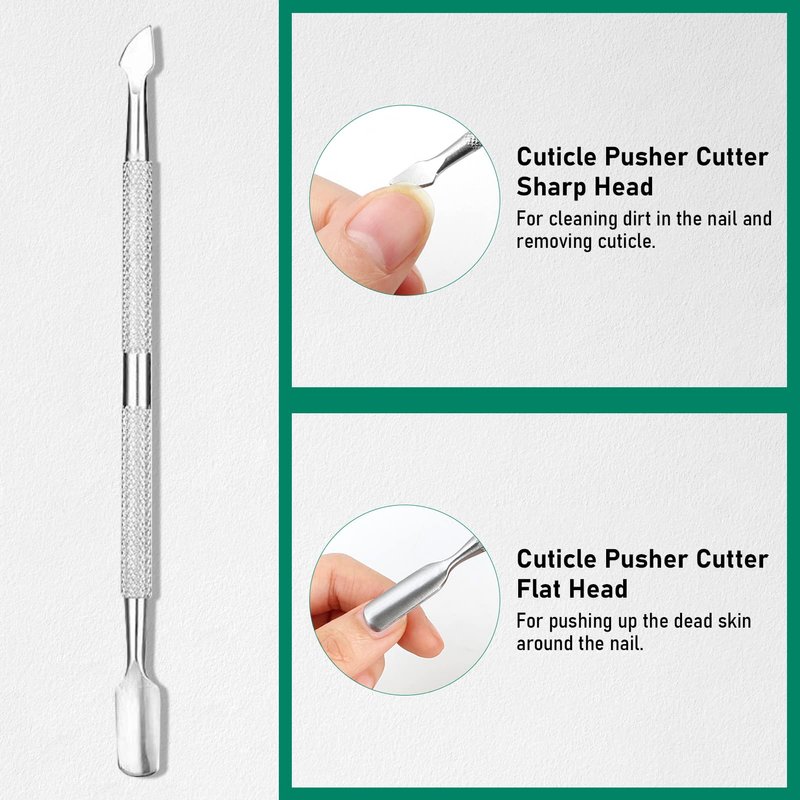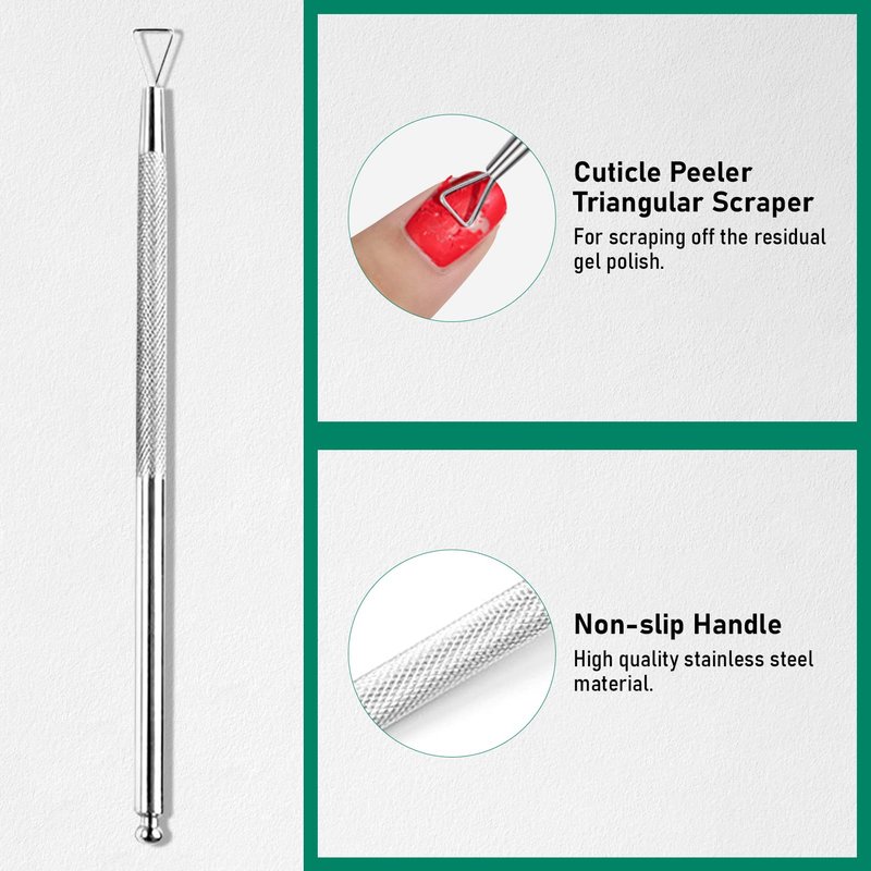- Cuticle Pusher & Cuticle Peeler: Cuticle pusher with double head design, the flat head for For pushing up the nail cuticle, the sharp head for cleaning dirt in the nail. Cuticle peeler for scraping off the residual gel polish. Anti-slip handle design, ergonomic, better grasp and control.
