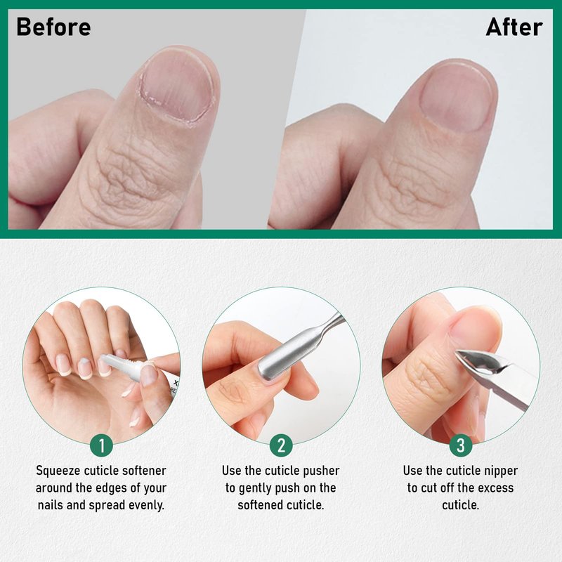 - Quickly Softens and Moisturizes Cuticles: Our 15ml cuticle remover easily penetrates dry cuticle, simply apply evenly to the cuticle on the nail edges, quickly softening cuticles and dead skin in 15-30s, gently moisturizing. Use with cuticle remover tool for clean cuticle removal.