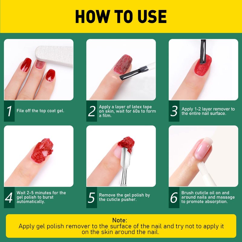 - Effective Nail Polish Remover: Our gel nail polish remover requires no foil soaking or wrapping, no tedious removal process. Just rub off the top coat with a nail file, lightly apply the gel polish remover to your nails, and after 2-5 minutes the surface of your nails will automatically burst, then remove it gently with a cuticle pusher.
