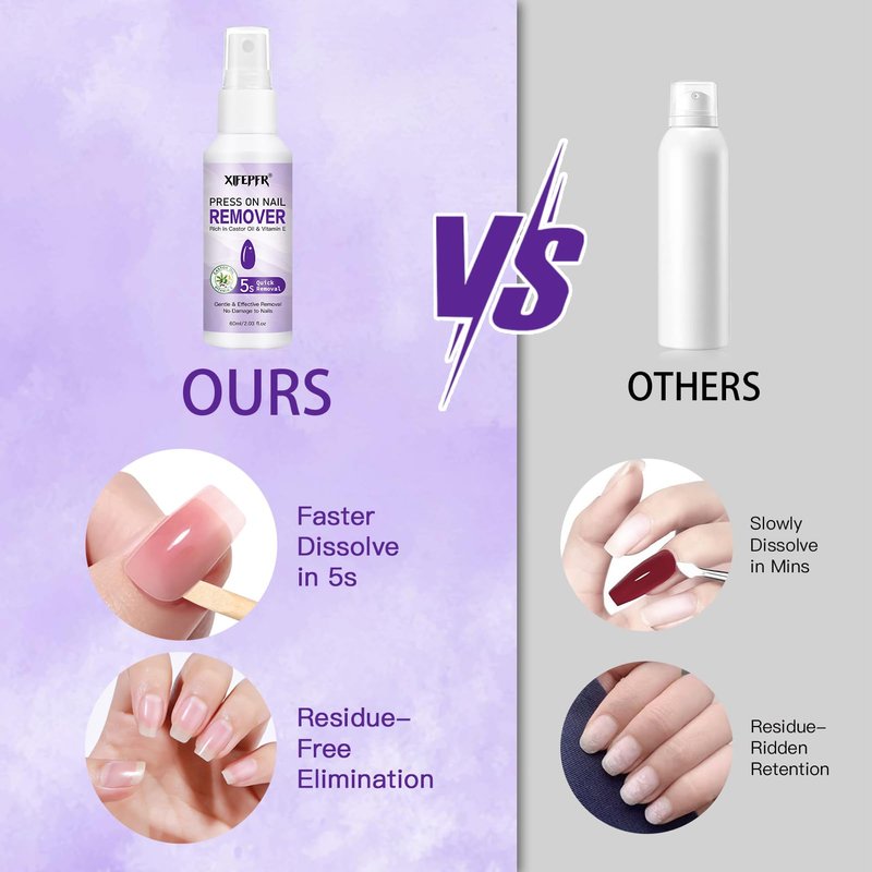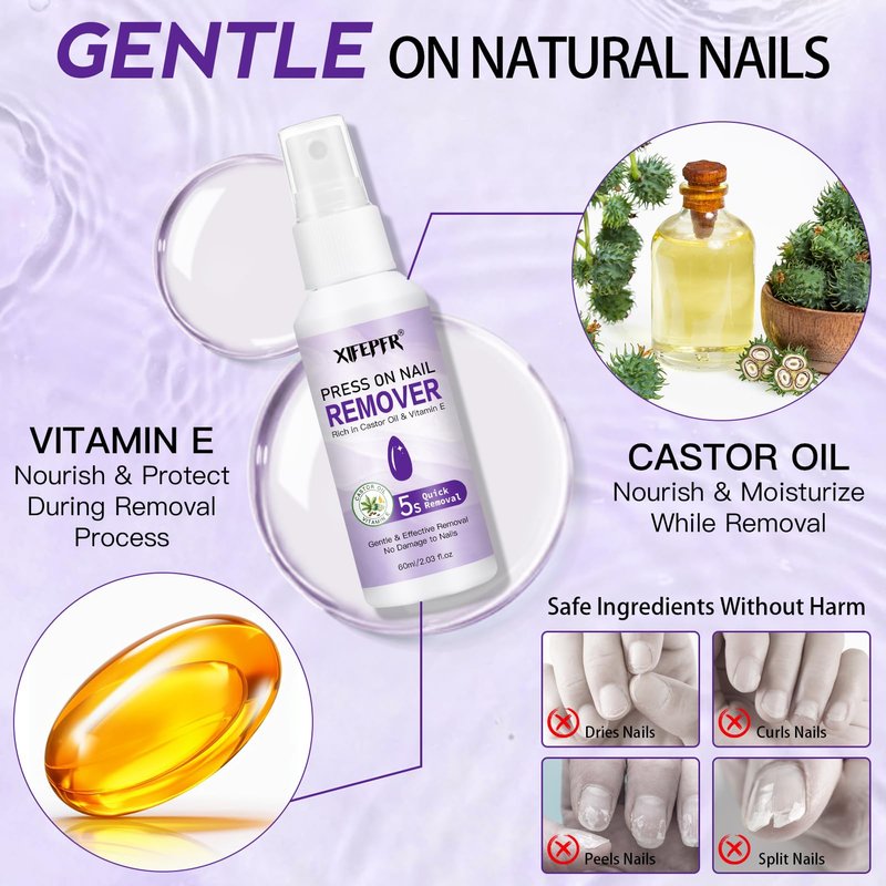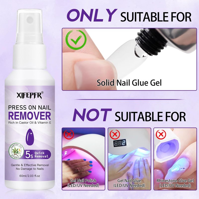 - Safe & Effective: Nail glue remover spray is made with a mild formula enriched with castor oil and Vitamin E. It effectively dissolves solid glues and nail adhesive tabs while ensuring that your nails are moisturized and protected without harming your nails.