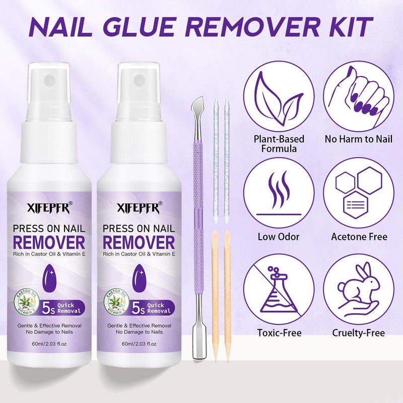 - Nail Glue Gel Remover Set: XIFEPFR nail glue remover kit includes 2pcs nail glue remover for press on nails, 1pcs cuticle pusher, 2pcs acrylic sticks and 2pcs wooden sticks. Easily and efficiently remove solid nail glue from nails or press on nails within 5 seconds without glue residue.