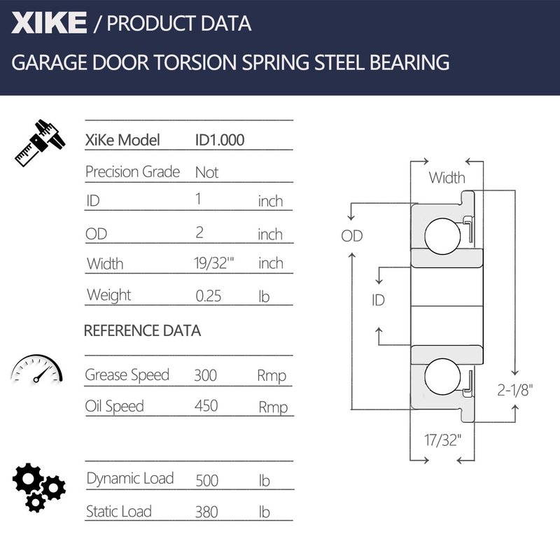 XiKe 2 Pack Garage Door Torsion Spring Stamping Steel Bearing 1" ID x 2" OD, Used with Center Support Only.