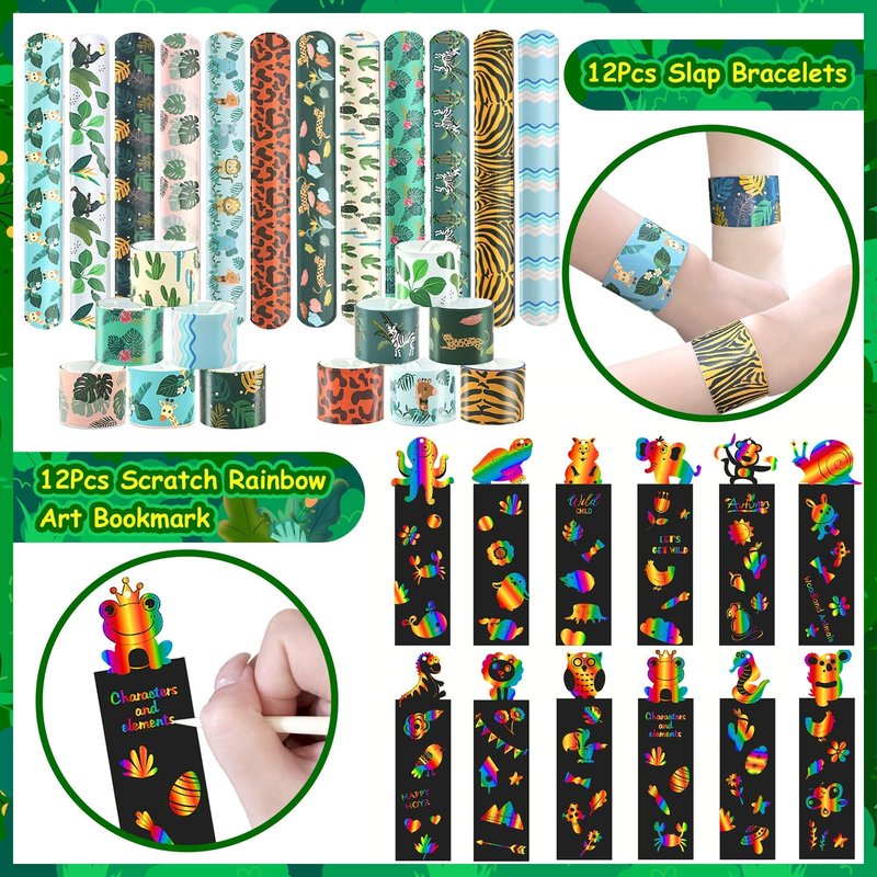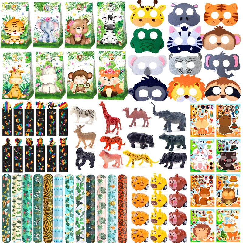 - PACKAGE INCLUDE - Just one set is enough for the whole jungle safari birthday party favors,include 12 animal bags,12 animal mask,12 slap bracelets,12 mini animal figures,12 animal pull back cars, 12 scratch art set,16 DIY stickers,Best for Fill Up the Birthday Bags.