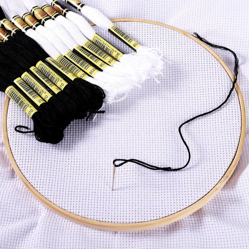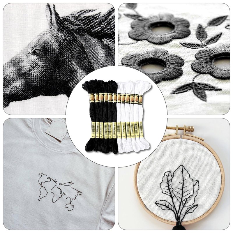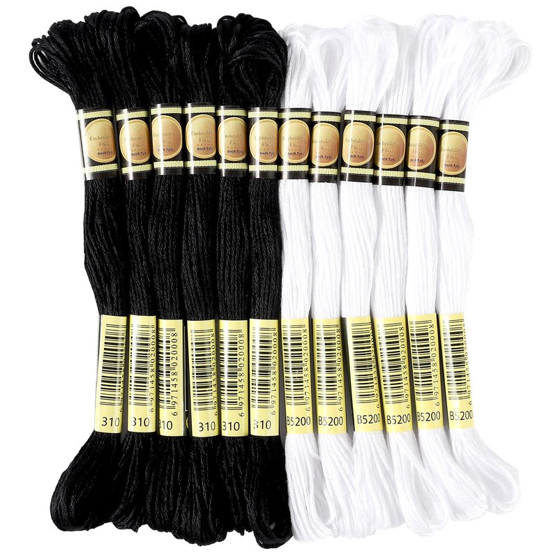 - 5. PACKAGE INCLUDING: 6 x black floss, 6 x white floss. Each Floss is 8.75 yards long and each skein of embroidery floss comes in 6 strands. Each Floss is tightly packed, just find the line head, pull it upright without tearing the wrapping paper.