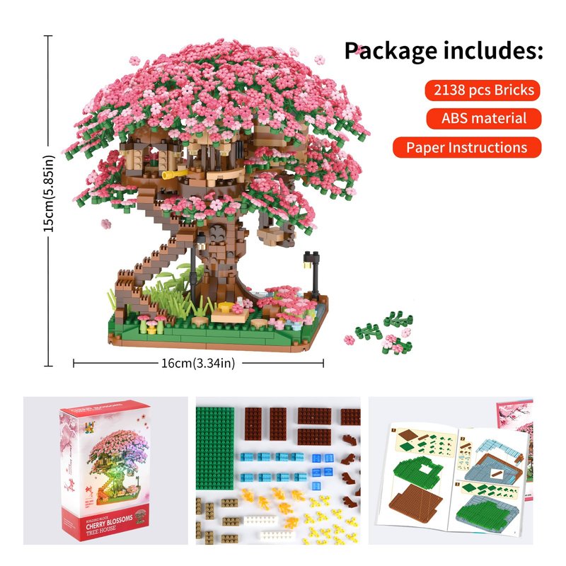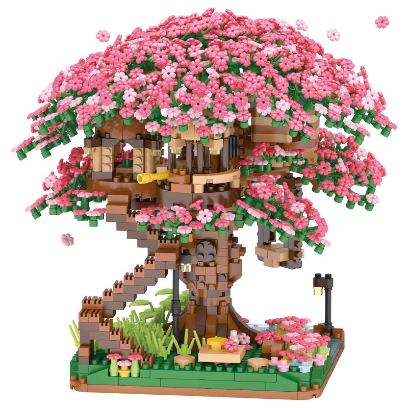 - 🌸【Dream Cherry Blossom Treehouse】This Cherry Blossom Treehouse building sets Consists of 2008pcs of Micro bricks. A unique idea of cherry blossom trees and huts cleverly combined together. Cherry blossom blocks in dark and light pink colours, beautifully bright and lush. 3 huts in a cherry blossom tree with stairs to the ground. Under the cherry blossom tree, there are ponds, street lamps, stone paths, flowers and plants, creating a dreamy scene.