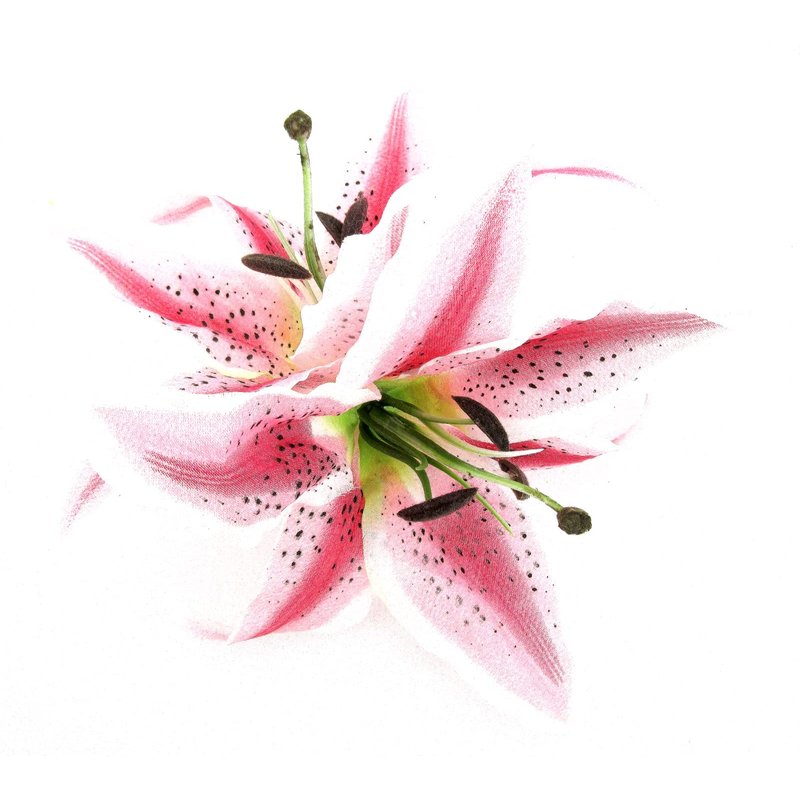 Two X large 8 inch tiger lilies in variegated shades of pink and cream. The petals are enhanced with color and lightly treated to keep its natural shape. Nestled together on a 3" single prong alligator clip with small teeth for a secure hold. This stunning hair accessory measures 10" long by 4" in in height. A striking accent for a tropical wedding, over a ponytail, updo or clip it to your hatband!