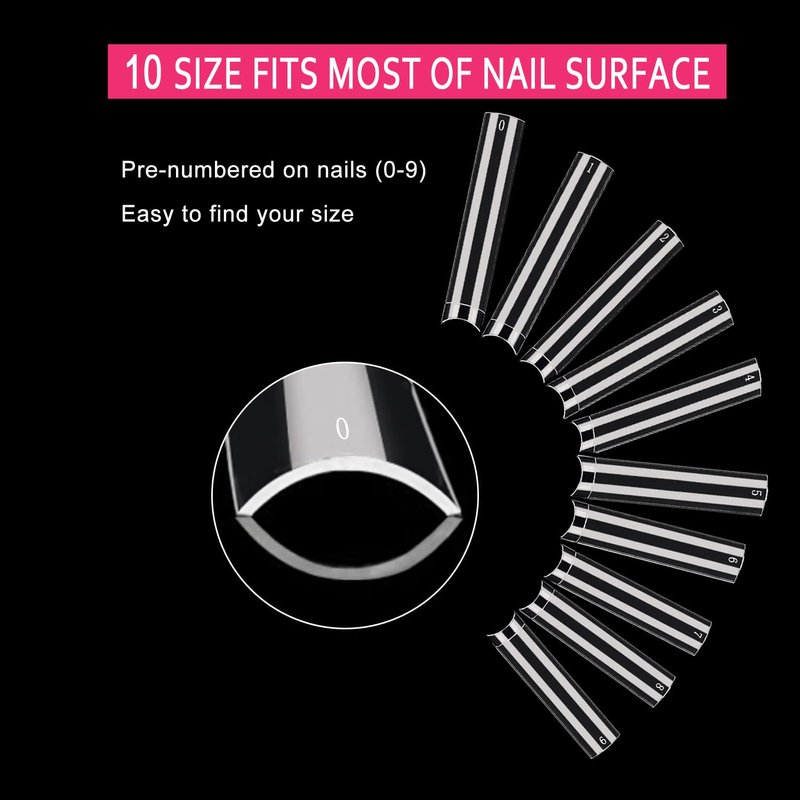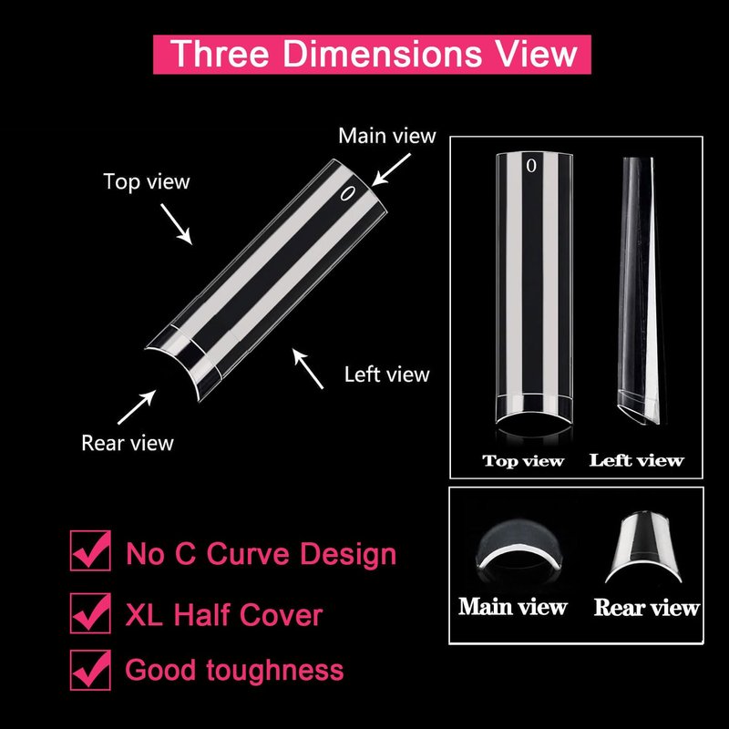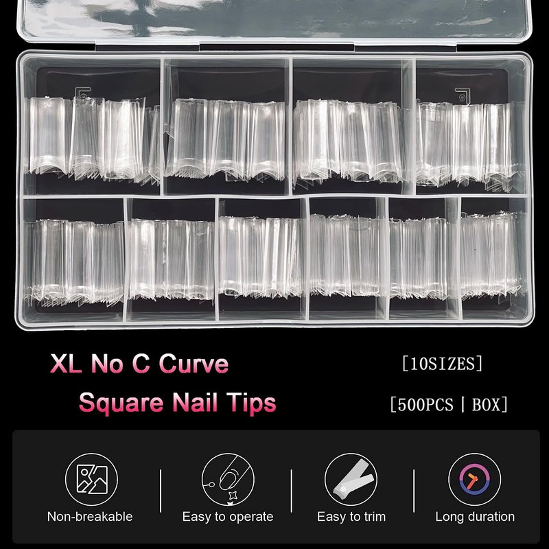 - 【DURABLE & SAFE】:These xl clear nail tips no c curve are made of premium soft resin gel, durable, flexible, no trace after bending. Nontoxic and tasteless, no harm to nails, available for pregnant, safe to use. The number of 500 pcs is very suitable for nail salons and nail tech, as well as nail art beginners.