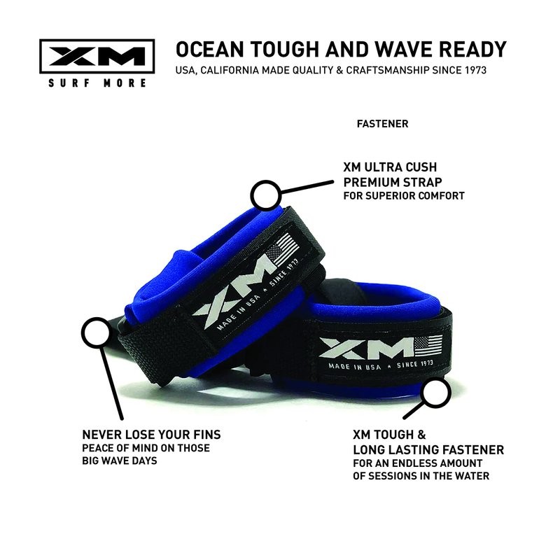 If you bodyboard or swim in the ocean or any other similar water conditions you are better off not risking being stranded with one or two missing swimming fins. Never a fun experience to be stranded without your equipment especially in remote areas. XM Surf More Fin Tethers are a comfortable leash for your favorite swim fins! (Fins not included.) Our Fin Tethers are designed to secure your ankles and swim flippers without worry. Made with a 1 inch hook and loop single-wrap strap with ultra strong velcro designed to last all kinds of conditions. Feel safe and enjoy your adventure without any restrictions on mobility when swimming, bodyboarding or bodysurfing. Material made for comfort so you do not experience any rubbing. The tethers loop onto the fin and attach at the ankle with velcro. Created by our highly trained XM artisans in our San Clemente, California, USA facilities. We feel so strongly about our premium high quality materials and craftsmanship we back it up like no other with our 3 Year Stoked Warranty. Get your XM Premium Swim Fin Tethers today and feel safe knowing your fins will not mysteriously slip off because of some giant wave coming down over you.