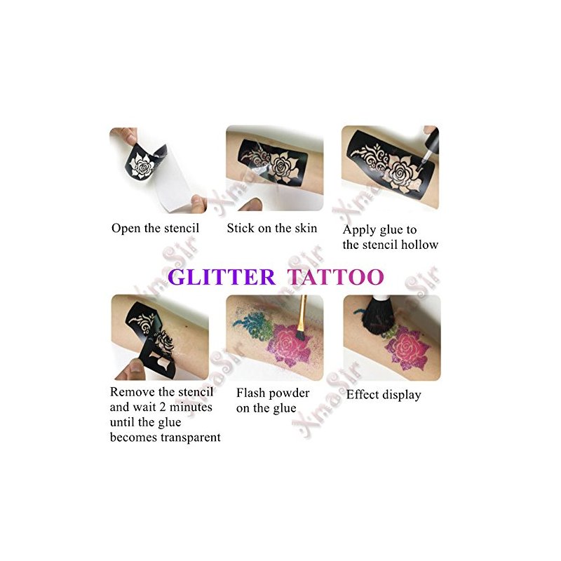 Using Method: 1.Choose the design you want and peel off white backing. 2.Make sure the skin is dry before applying the sticker. Place the sticker on the skin in the direction you want and press firmly, making sure there are no wrinkles or blebs, remove the clear film from the sticker. 3.Use the brush appliator in the bottle, and apply the glue on the skin showing through the stencil. 4.Remove the stencil after approximately 1-2 minutes. 5.Use the small cosmetic brush to apply the glitter to the areas with glue. Make sure glitter completely covers all areas with glue. (You may mix colors) 6.Use the large cosmetic brush to press down the glitter, after the glitter has been firmly set, brush away any excess glitter. 7.Glitter tattoos will last approximately one week under normal conditions.keep skin dry.