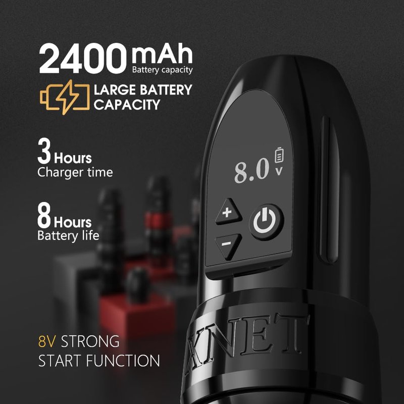 - Easy to Use: The Xnet tattoo pen machine has visible LCD screen shows operating voltage and remaining power, 0.5V voltage adjustments, 4.5V-12V adjustable voltage, can support long-term tattoo work, output stable, battery capacity is 2400mAh, designed for tattoo artrist or beginner.
