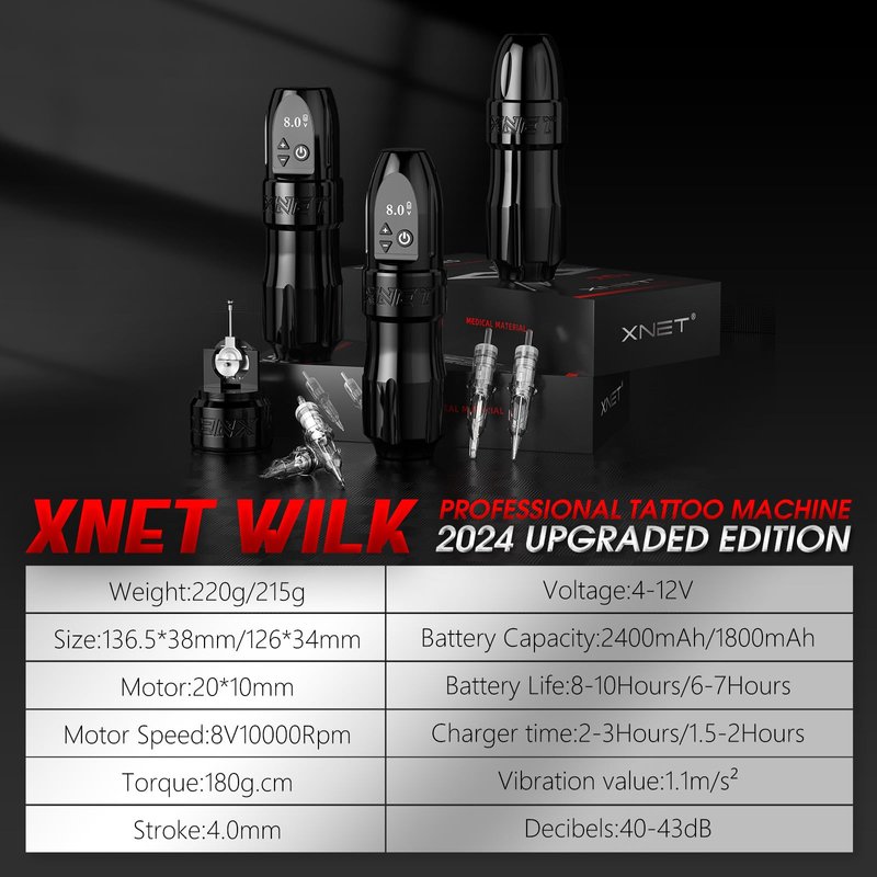 - 1800/2400mAh Battery: The Xnet wireless tattoo machine has LED screen shows operating voltage, remaining power, working time, hertz and Ampere for improved accuracy. Working voltage: 4.5-12V, ±0.1V adjust,73-195 Hertz. One battery capacity is 2400mAh and a run time lasting up to 7 hours( two batteries support 14 hours). Notice: Please fully use up the battery before charging for the first time.