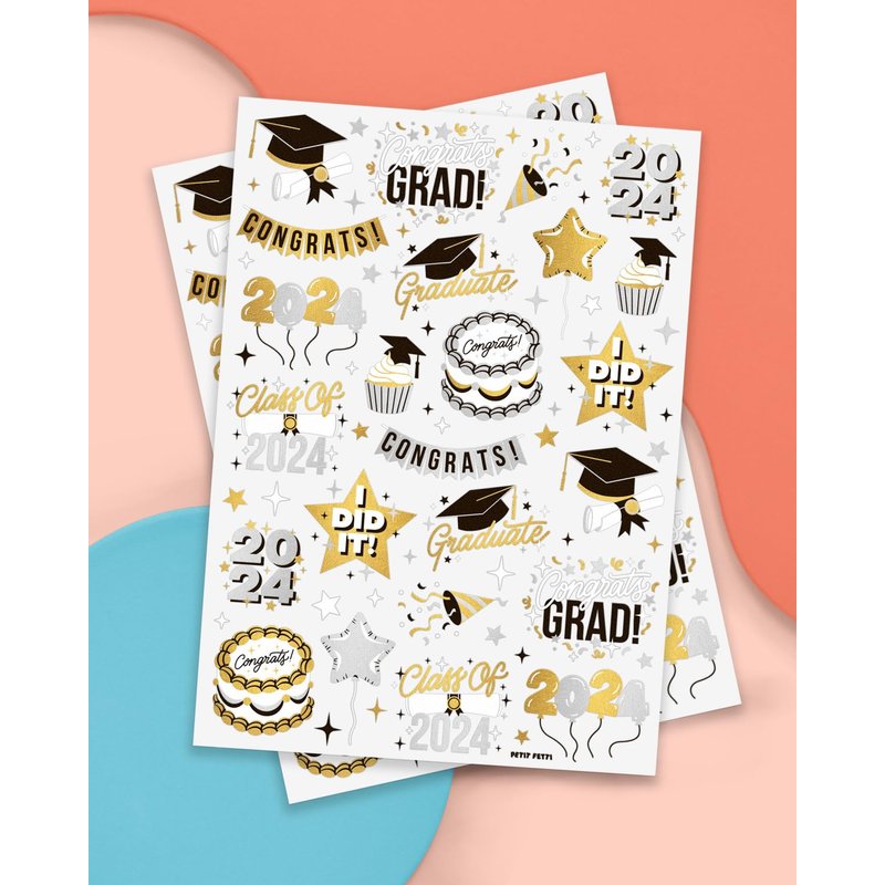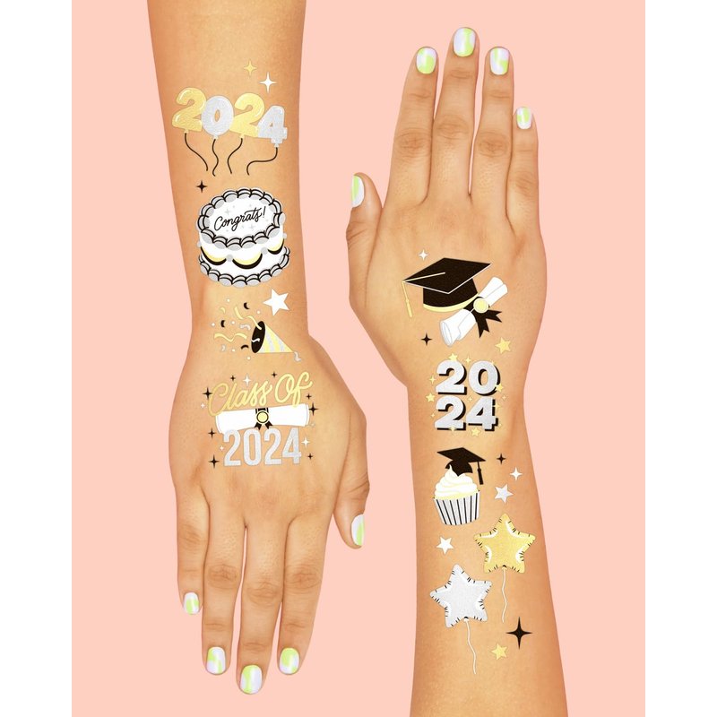 Our 2024 graduation foil tattoos are the perfect addition to your grad party! There are 48 total designs to choose from, all proven to be waterproof, durable and skin safe. Inspired by your graduation, we created exclusive designs of cake, stars, balloons, banners, graduation caps and tassels + more that makes for the cutest party favors. With a simple application process, everyone at the party will love these. Want more? We make a whole bunch more party supplies just as cute as these in our storefront!