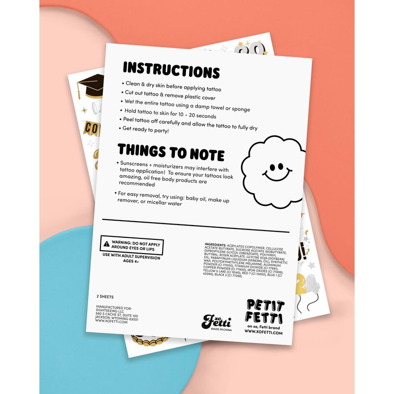 - Exclusive Designs: our super unique hand drawn designs are guaranteed to be a party hit. Tat up with hand drawn designs like: cake, stars, balloons, banners, graduation caps and tassels + more!