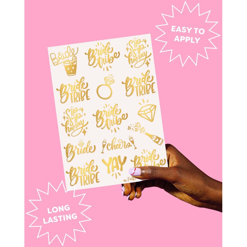 - Bachelorette Tattoos For The Whole Tribe: two sheets with a total of 30 metallic gold tattoos featuring a unique design for the bride + her entire bride tribe with super cute additional bride straw, diamond + champagne icons to get the party started!