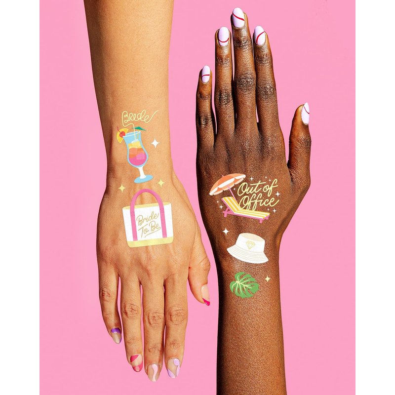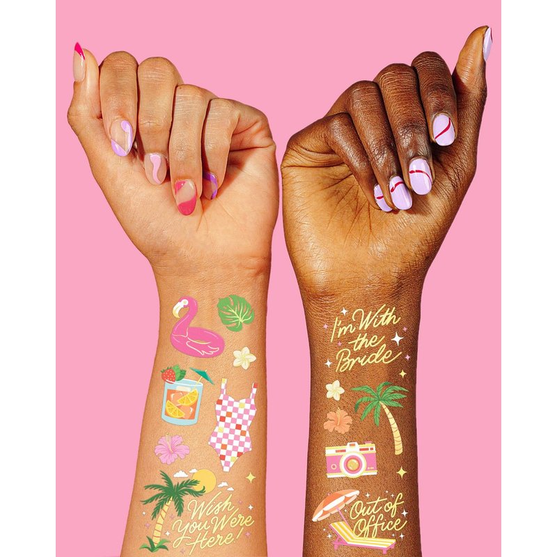 - Exclusive Designs: our super unique hand drawn designs are guaranteed to be a party hit. Tat up with hand drawn designs like: palm trees, martinis, swimsuits, cocktails, cameras, totes + more!